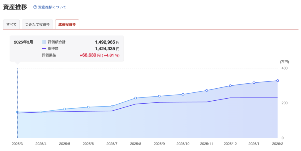 成長投資枠の資産推移を見ると、一年前には150万円ほどだったのが、現在は300万円を超えています。
