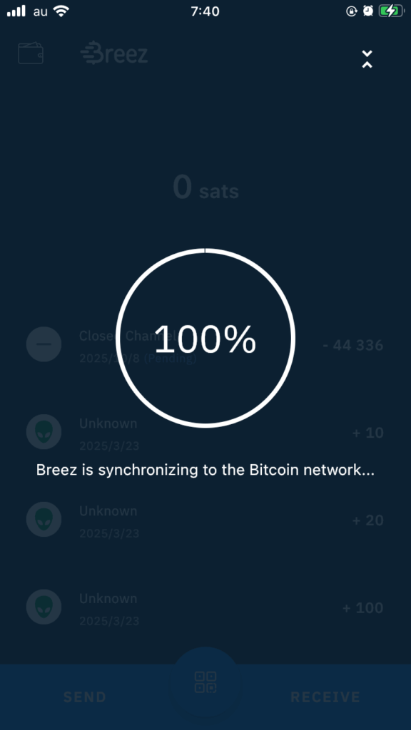 再度Breezアプリを起動し、稼働させたままネットワークとの同期完了を待ちます。