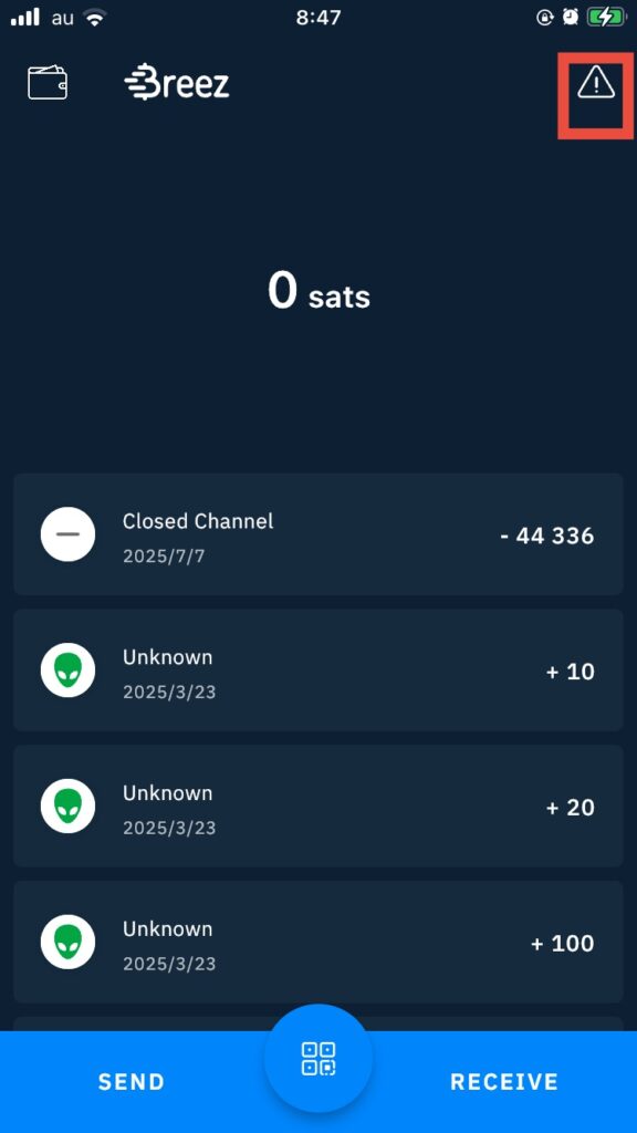 画面右上に警告マーク(⚠️)が表示されていたらうまくいっている証拠です。警告マークをタップして、任意のビットコインアドレスに残高を送金しましょう。