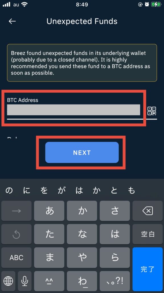 このアイコンをタップすると「Unexpected Funds」画面に遷移し、残高を任意のBTCアドレスに送信することができます。