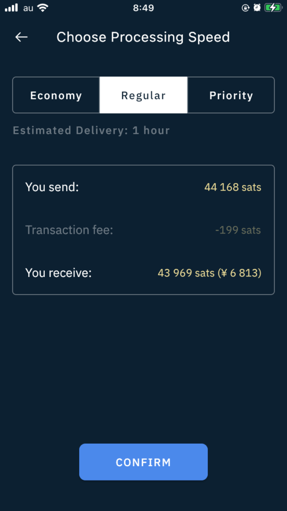 最後に手数料を選択し、「CONFIRM」ボタンをタップすると出金できます。