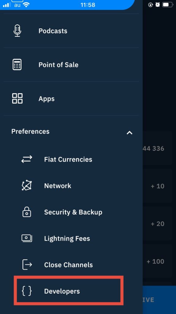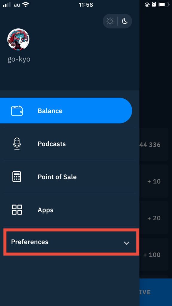 画面左上のウォレットマークより進み、メニュー一番下の「Preferences」をタップします。