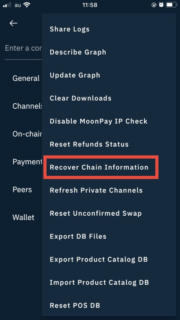 表示されるメニューより、「Recover Chain Information」を選択します。